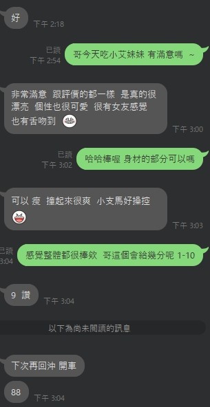 可配合 :按摩,69,陪洗,共浴,殘廢澡,LG(舌吻)依氣氛衛生而定,可親嘴,無套吹,品鮑,舔蛋,輕功,過水,漫遊,奶推,屁推,變裝(自備免付),絲襪(自備免付),中文溝通,快餐,2S